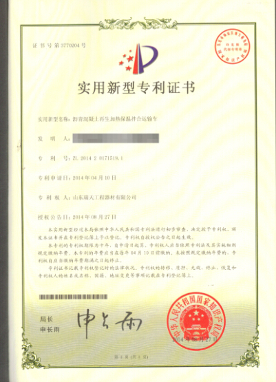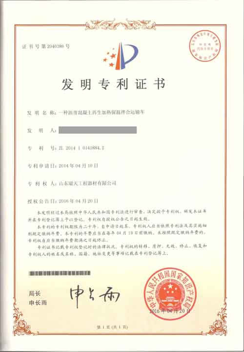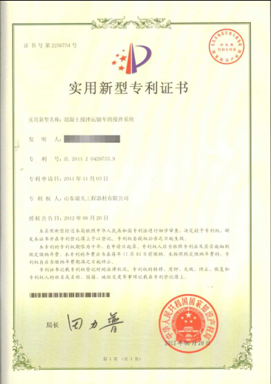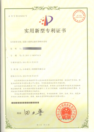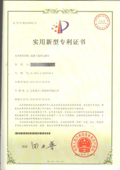 • 混凝土攪拌運(yùn)輸車實(shí)用新型專利證書